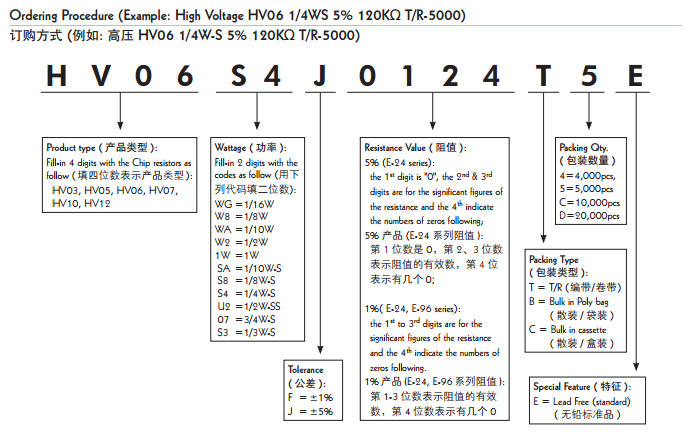 根據(jù)功能用途不同表達(dá)型號方式也有區(qū)別,如厚聲的高壓厚膜晶片電阻,型號以字母開頭HV03, HV05, HV06, HV07,HV10, HV12。