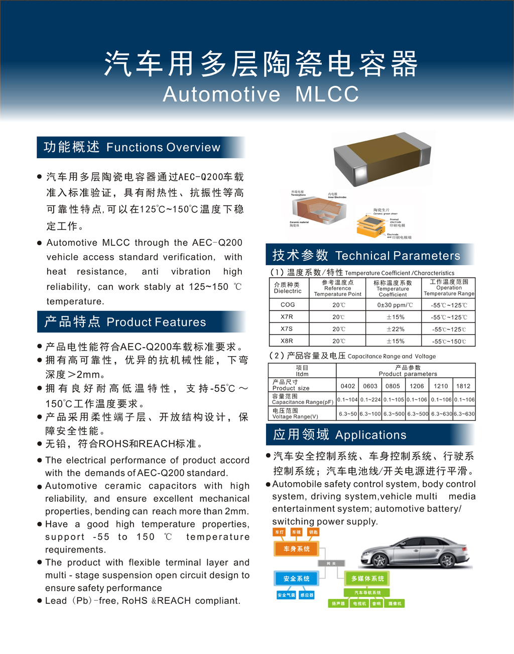 汽車用多層陶瓷電容器通過AEC-Q200車載準(zhǔn)入標(biāo)準(zhǔn)驗(yàn)證,具有耐熱性、抗振性等高可靠性特點(diǎn),可以在125℃~150℃溫度下穩(wěn)定工作。